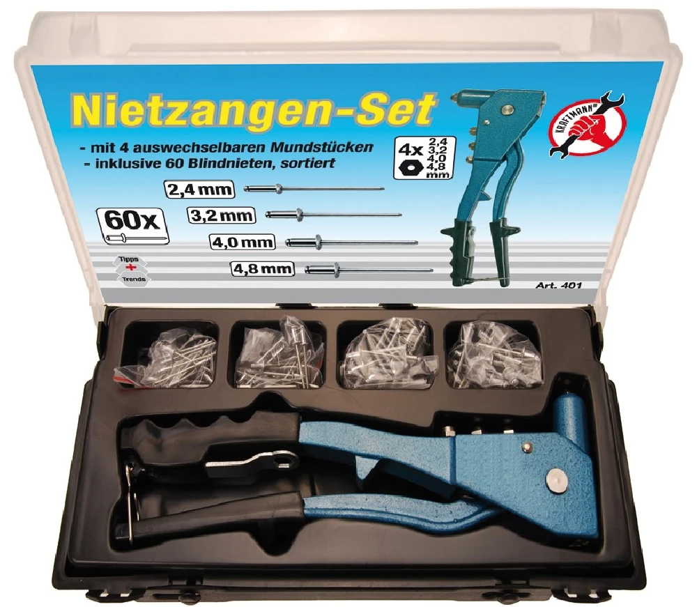 Nietzange mit 60 Nieten und 4 Mundstücken | 2,4 / 3,2 / 4,0 / 4,8 mm