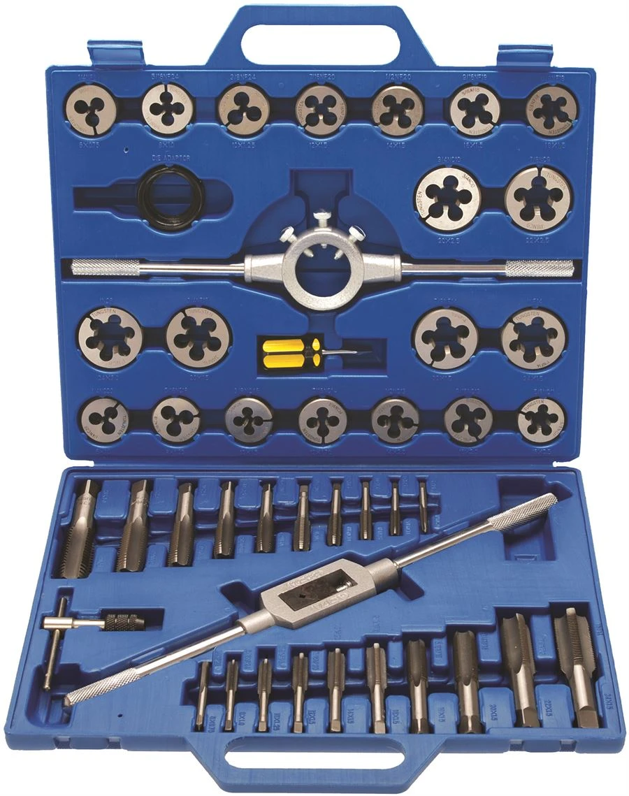 - 20 Gewindebohrer für Innengewinde und 20 Schneideisen für Außengewinde (1x je Größe): M6 x 0,75 – M8 x 1,0 – M6 x 1,0 – M8 x 1,25 – M10 x 1,25 – M10 x 1,50 – M12 x 1,50 – M14 x 1,50 – M16 x 1,50 – M18 x 1,50 – M20 x 1,50 – M22 x 1,50 – M24 x 1,50 – M12 x 1,75 – M14 x 2,0 – M16 x 2,0 – M18 x 2,5 – M20 x 2,5 – M22 x 2,5 – M24 x 3,0