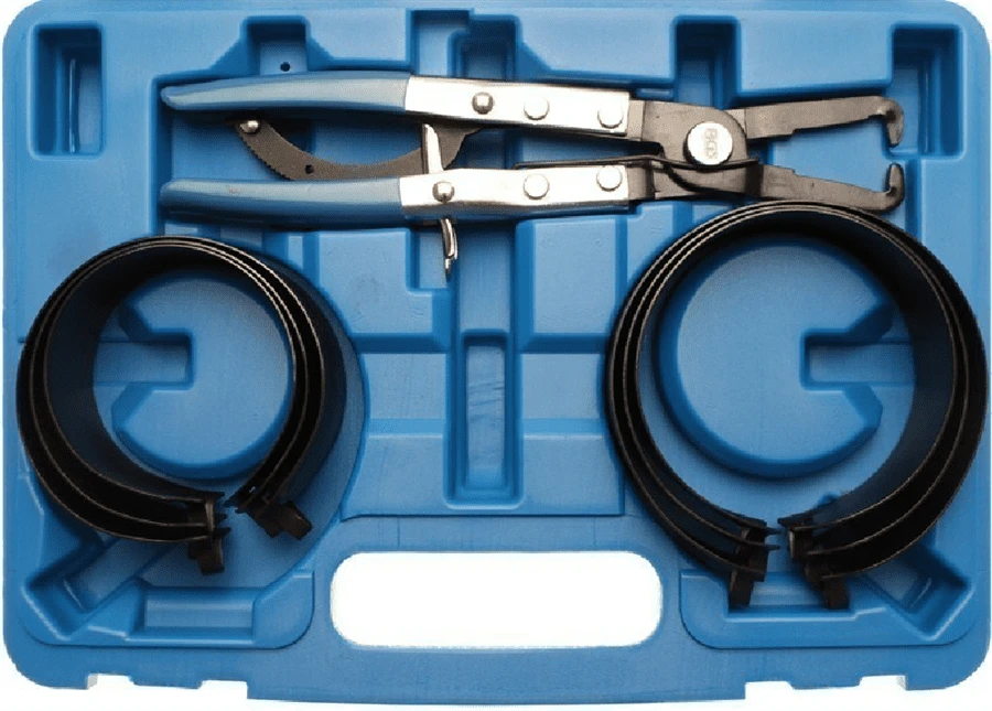- bestehend aus Spannzange mit selbstfeststellender Ratschenfunktion und 6 auswechselbaren Spannbändern 73 – 79 mm, 79 – 86 mm, 86 – 92 mm, 92 – 98 mm, 98 – 105 mm, 105 – 111 mm