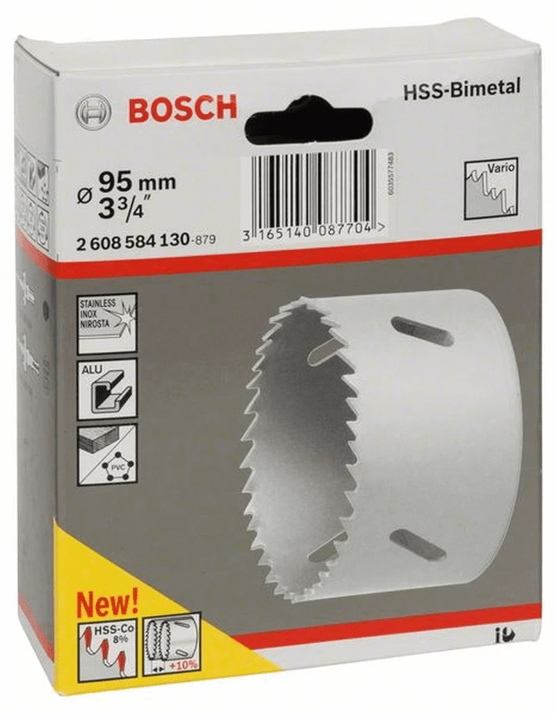 Lochsäge HSS-Bimetall für Standardadapter. Durchmesser: 95 mm, Durchmesser in Zoll: 3 3/4 Zoll, Länge: 44 mm. Die Ausgeglichene. Hohe Standzeit und Schnelligkeit. Mit Varioverzahnung für einen schnellen und präzisen Schnitt. HSS-Bimetall mit 8 Prozent Kobaltlegierung für extreme Widerstandsfähigkeit und lange Lebensdauer. Mit Standardadaptersystem für herkömmliche Aufnahmesysteme. Einsteckende sowohl mit SDS-plus als auch Sechskantschaft.