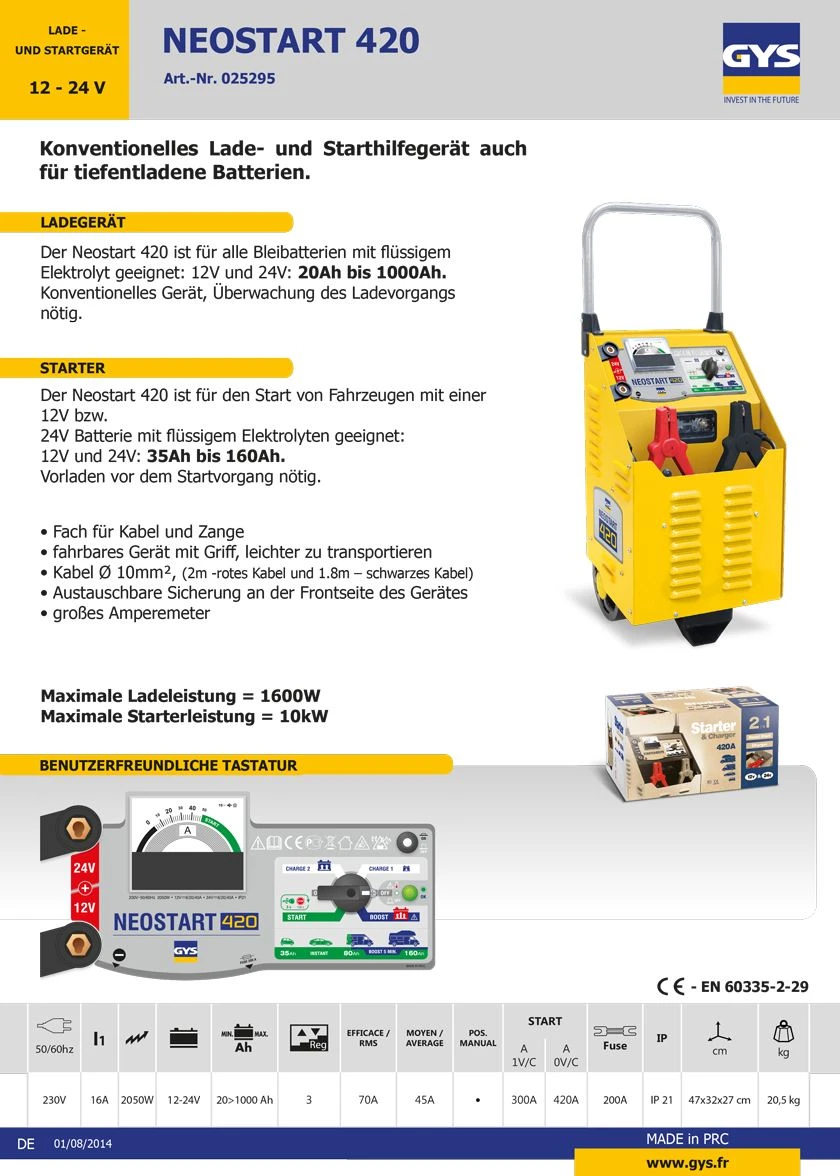 GYS NEOSTART 420 Batterieladegerät + Starthilfegerät 12-24V 230V 025295