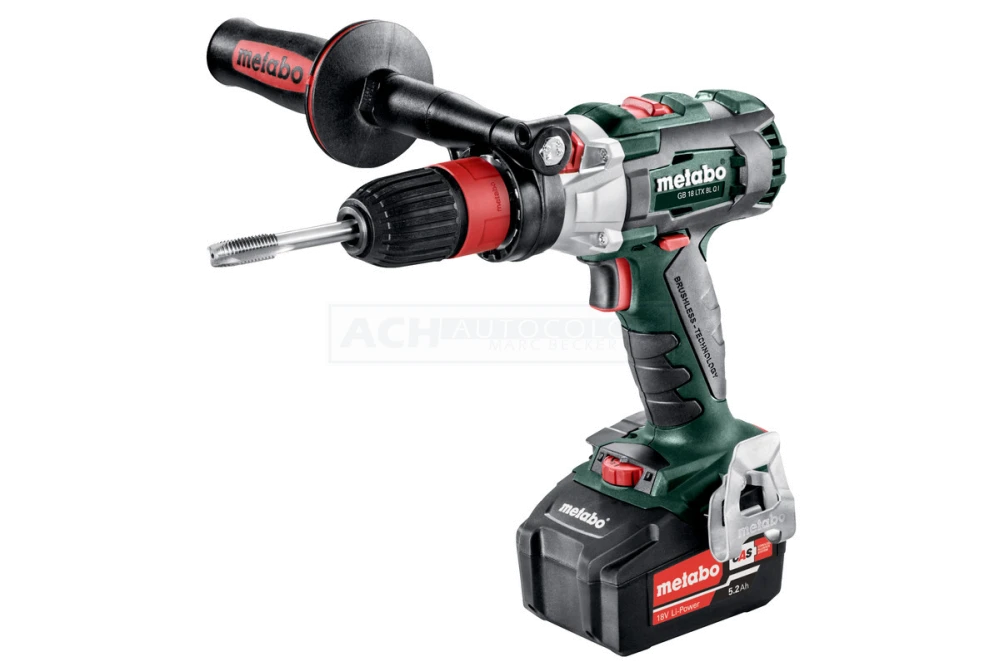 Schnellwechsel-Gewindebohrfutter M4-M6, Schnellwechsel-Gewindebohrfutter M8-M12, Zusatzhandgriff, Gürtelhaken und Bitdepot, 2 Li-Power Akkupacks (18 V/5,2 Ah), Ladegerät ASC 55 „AIR COOLED“, Kunststoffkoffer